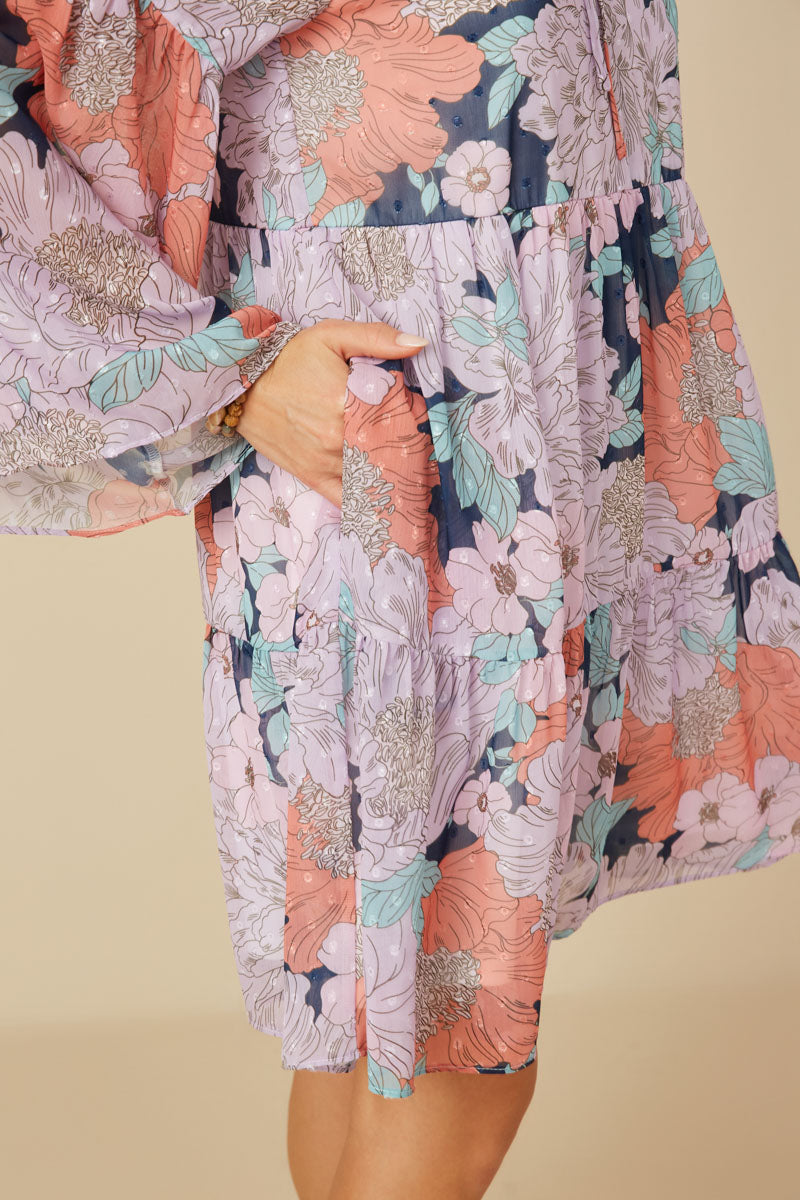 Our Swiss Dot Floral Print Tie Neck Dress Features:
