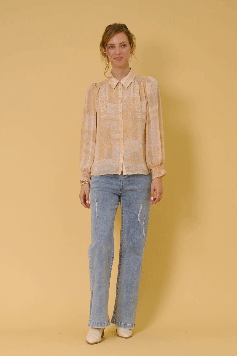 Our Patch Print Smocked Cuff Collared Shirt Features: