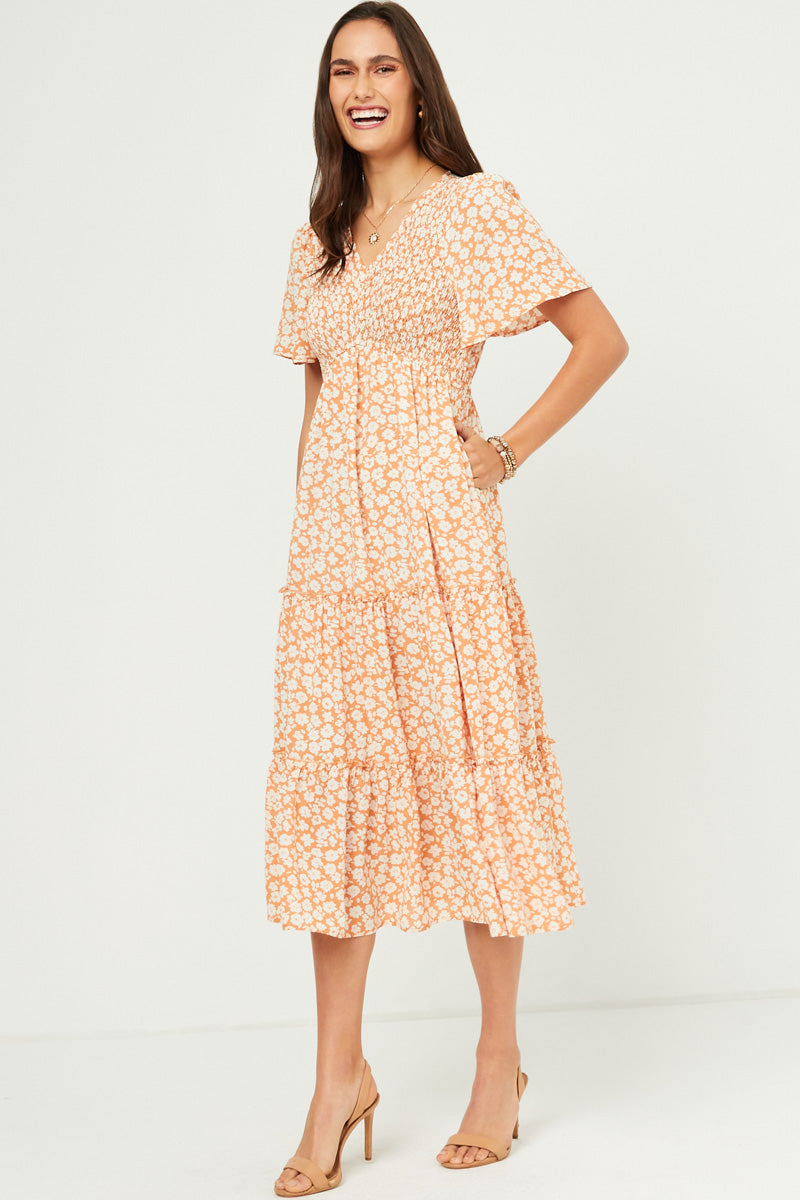 Our Floral Print Smocked V Neck Tiered Dress Features:
