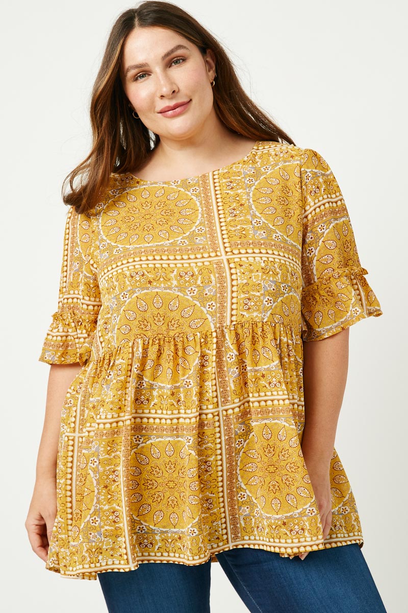 Our Bandana Print Ruffle Sleeve Peplum Top Features: