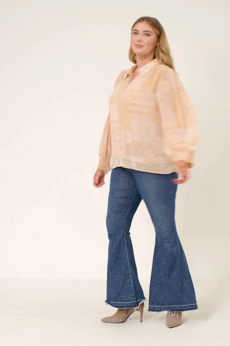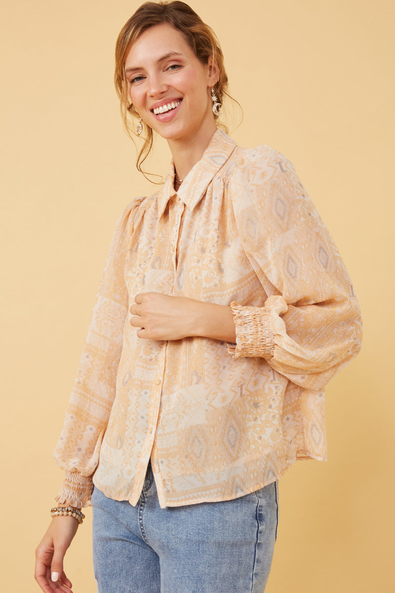Our Patch Print Smocked Cuff Collared Shirt Features: