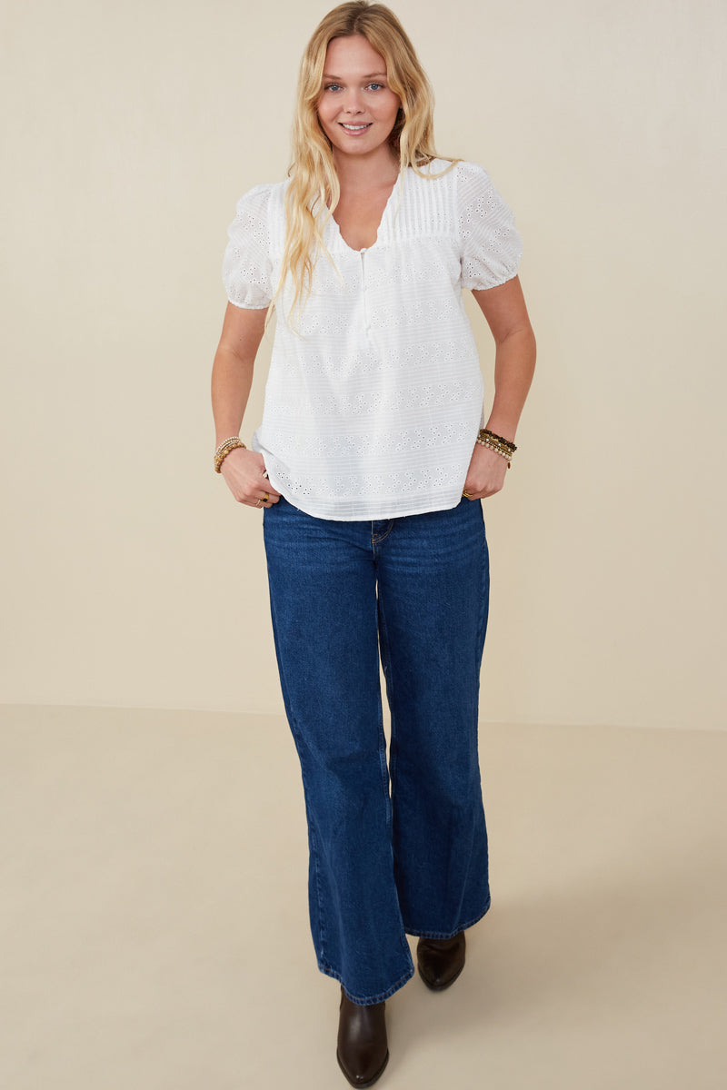 Our Pleated V Neck Floral Eyelet Blouse Features: