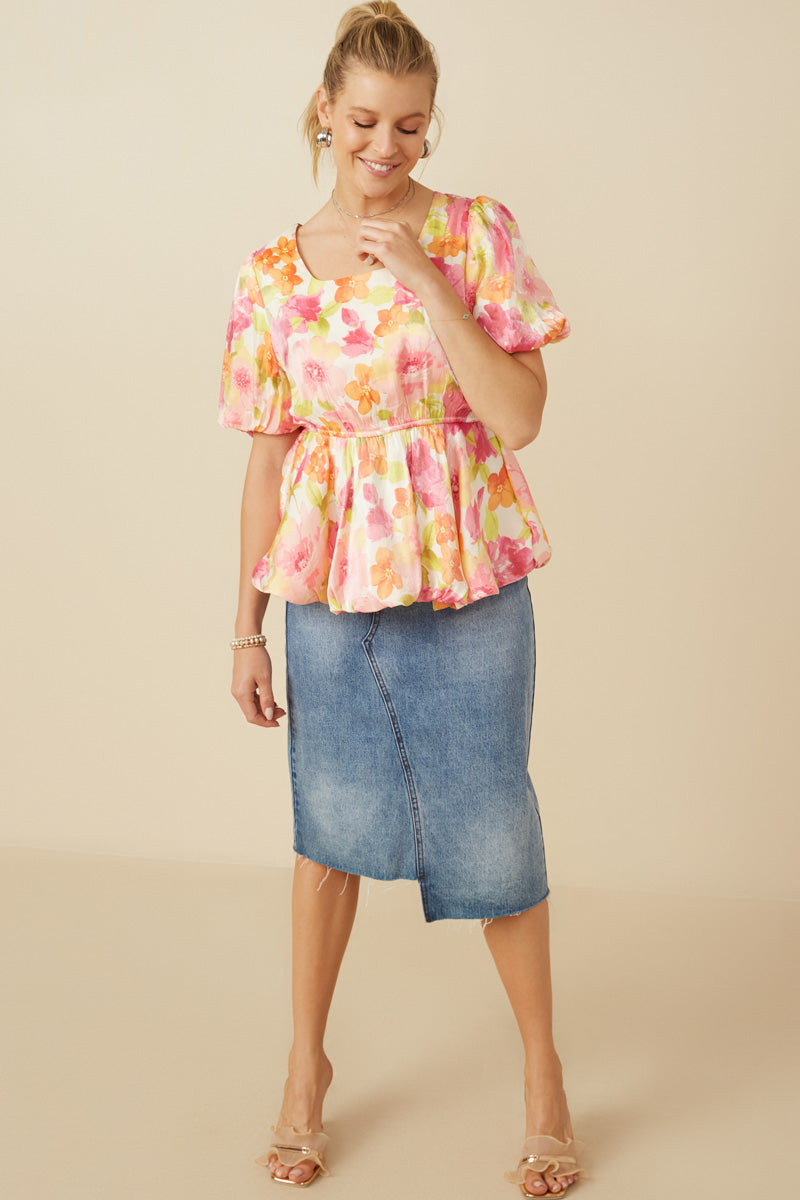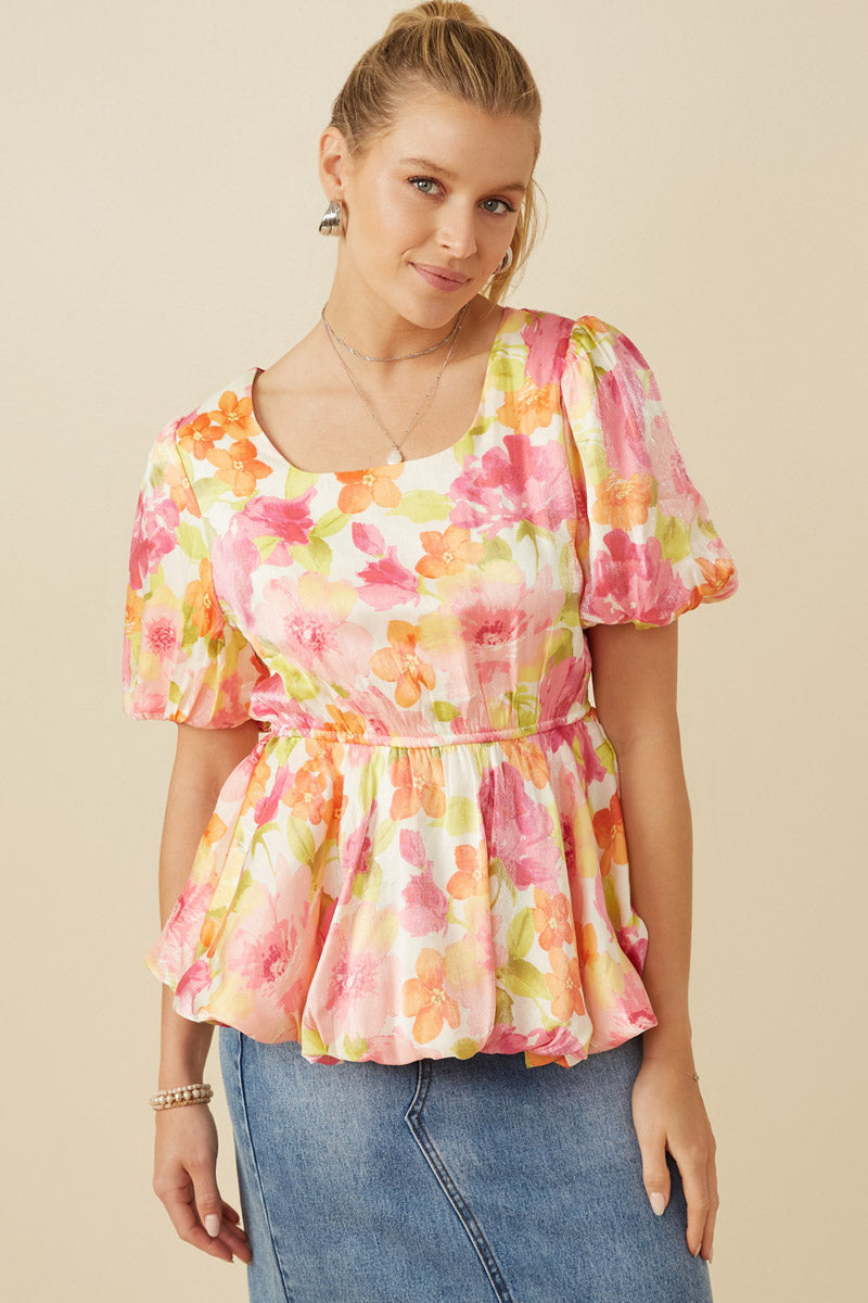 Satin Soft Floral Bubble Hem Foiled Peplum Top