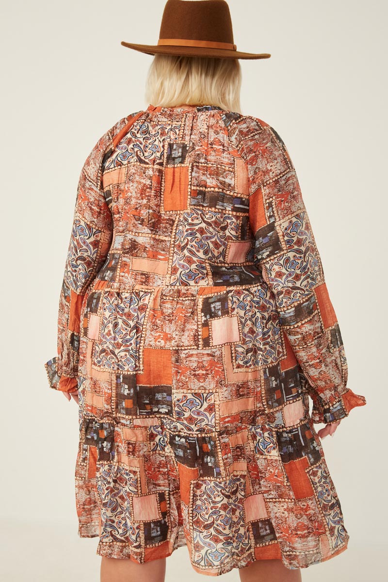 Paisley Patch Print Ruffle Neck Chiffon Dress