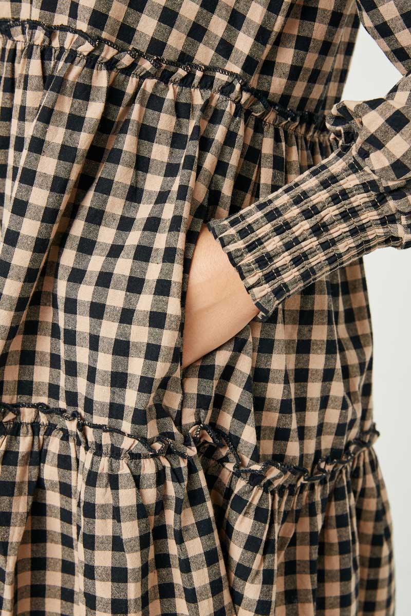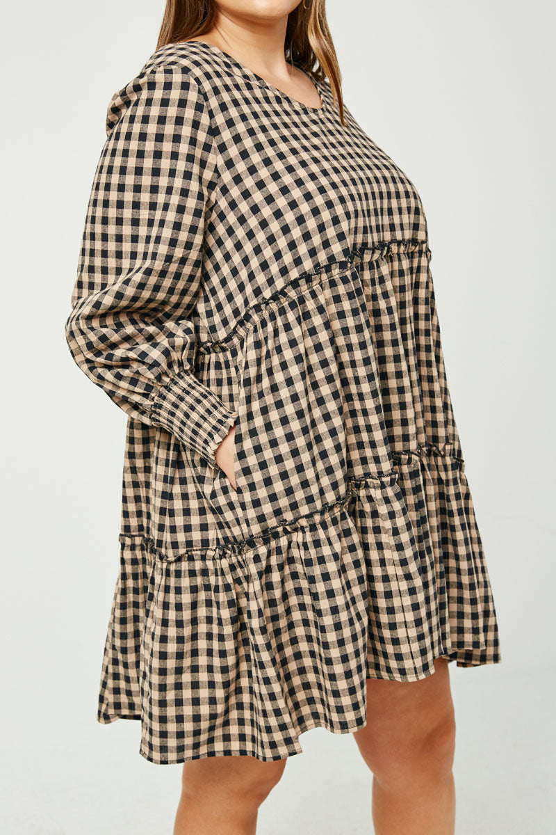 Our Smocked Cuff V Neck Tiered Plaid Dress Features:
